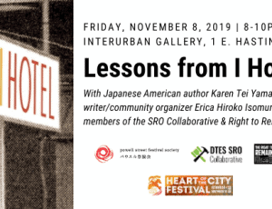 Friday, November 8 from 8-10pm InterUrban Gallery, 1 E. Hastings, entrance on Carrall FREE In this conversation between author Karen Tei Yamashita and writer/community organizer Erica Hiroko Isomura,… More ›